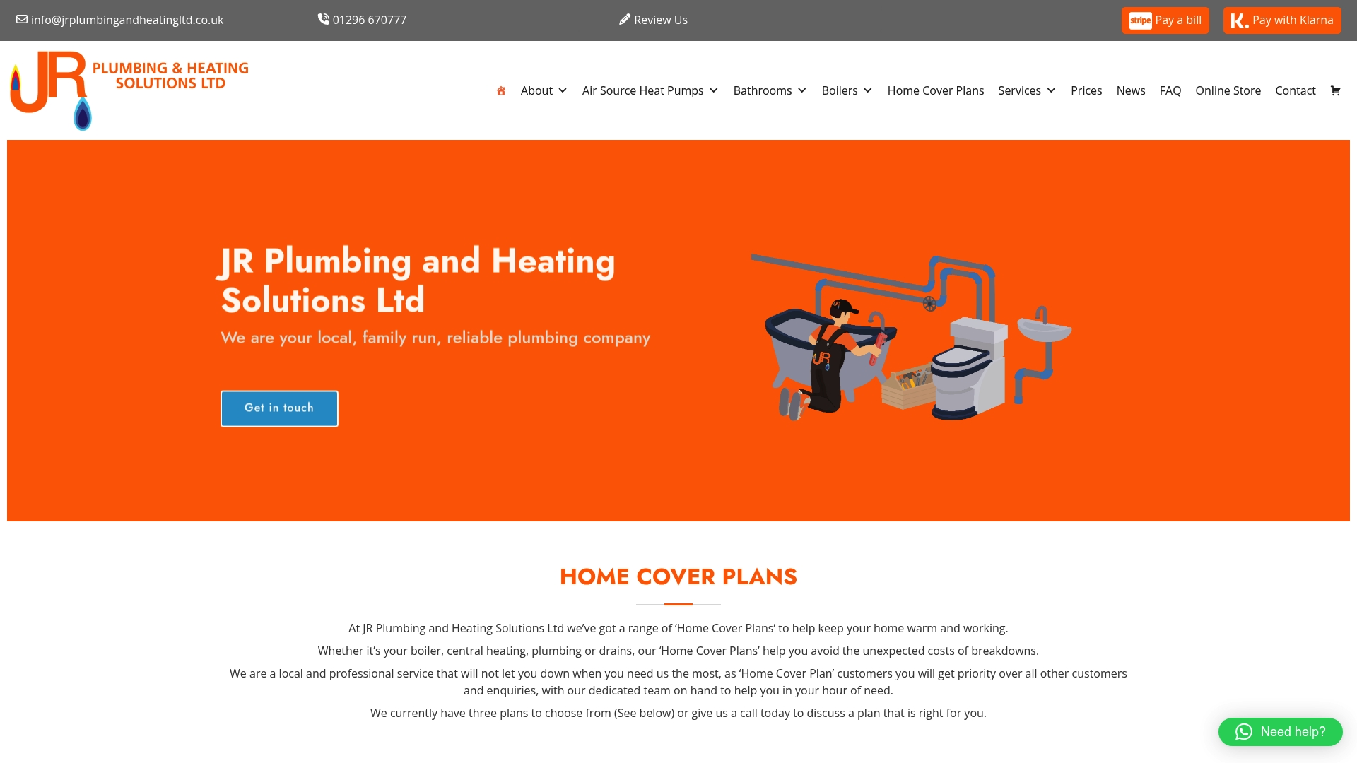 Home Cover Plans start from £21 per month for the Lite plan, with other plans at £32 and £35 per month. Specific installation and repair prices are not listed online; customers are asked to contact JR Plumbing and Heating Solutions Ltd for a tailored quote.