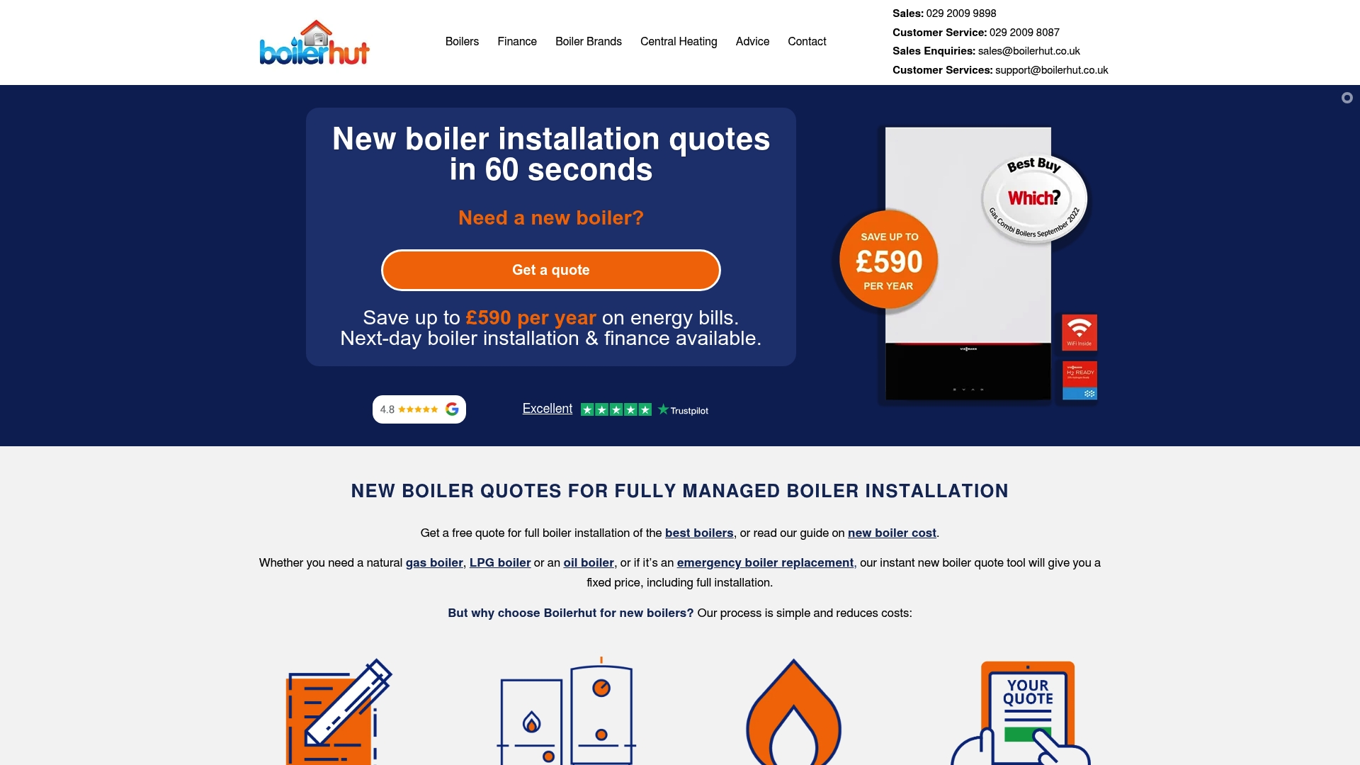 | Boilerhut | Instant online quotes, wide boiler brand selection, certified engineers | Quick quotes, high-quality brands, significant post-installation support | Limited to the UK, specific pricing varies by location | Pricing available via online quoting tool, with finance options available |