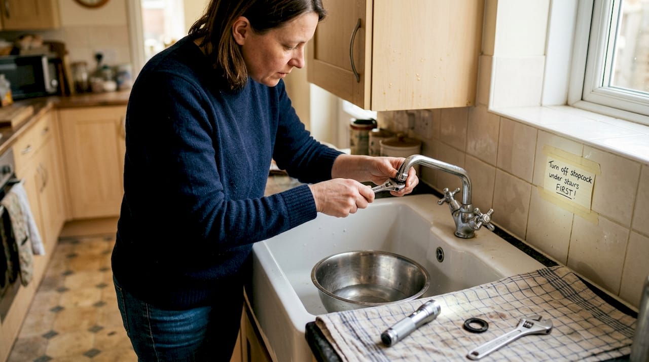 Safety must always come first. Locate your home's main stopcock before you need it — typically found under the kitchen sink or where the supply enters the property. Turn it off before beginning any repair, and keep a bucket and towels nearby to catch residual water in the pipes. Wear rubber gloves when working near waste pipes to protect yourself from bacteria.
