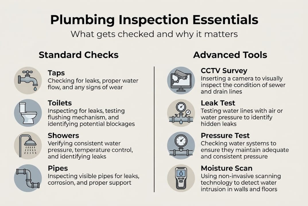 A standard inspection covers pipework, taps, toilets, water pressure, drainage, and leaks. For underground issues, CCTV drain surveys use cameras to inspect drains for cracks, root damage, or collapse.